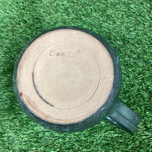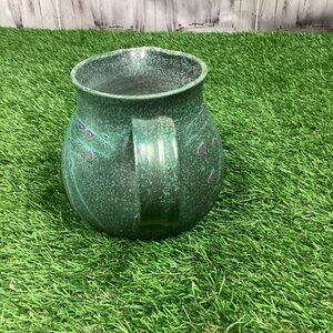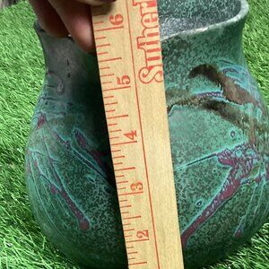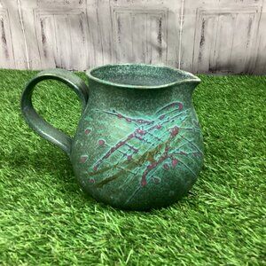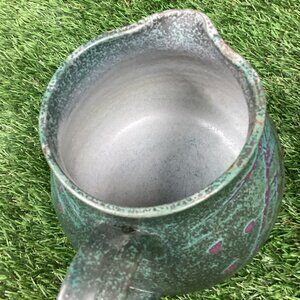 Beautiful piece, purchased at an art show. Green pottery with pink details. Perfect size for displaying cut flowers. Or use it as a pitcher. Good used condition.