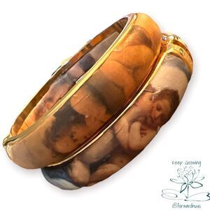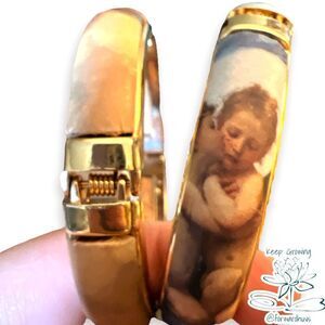 This is a listing for two bracelets made of wrapped paper / fabric which are absolutely spectacular. The earth tone colors of Raphael’s Two Cherubs from the Sistine Madonna are great for any outfit and also look fantastic next to other bracelet which depicts the stunning art, Angles and Cupids, of William Adolphe Bouguereau.