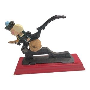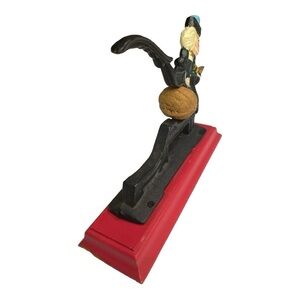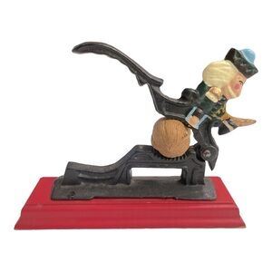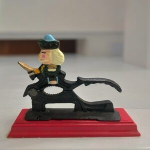 Nutcracker. Crafted from durable cast iron material, this nutcracker stands at 5.25 inches tall and measures 7 inches in length. The soldier design with hand-painted colors adds a unique touch to your decoration. Please note due to age this piece does show wear, some color are missing from the wood piece and a little chipping of the wood, but that's where the vintage charm comes in.