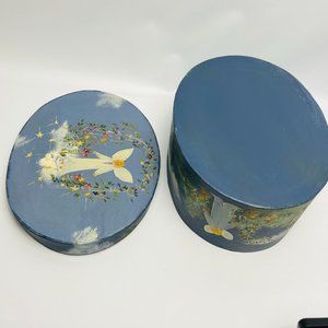 Hand Painted Angels Scene 8.5" Oval Lidded Cardboard Storage Trinket Box Vtg