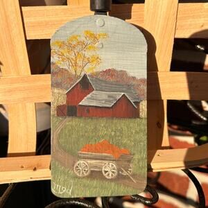 Farm scene with barn, autumn leaves, and wagon full of pumpkins, hand painted