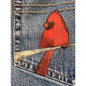 Unique hand-painted stretch denim jeans featuring a cardinal design on the back pocket. Comfortable fit and stylish look perfect for casual outings.