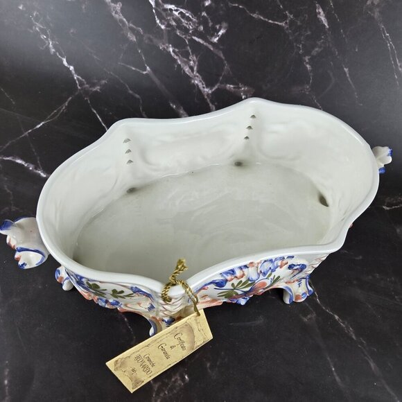This beautiful ceramic compute bowl is handmade in Italy. The fully removable lid and bowl are decorated with flourishes and openings that are highlighted by the handpainted florals and swirls. Footed. This bowl could be used as a centerpiece, a bread bowl or a display piece an a buffet or table or as storage on a vanity.