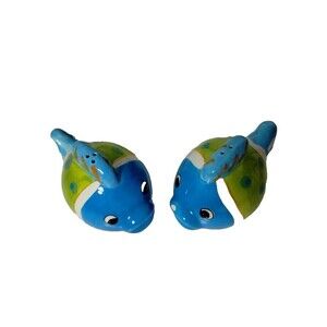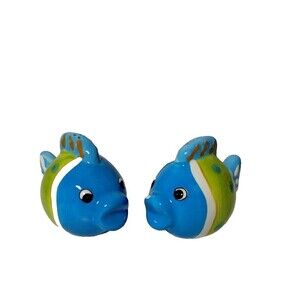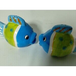 Hand Painted Ceramic Fish Shaped Salt and Pepper Shakers - Blue, Green, White