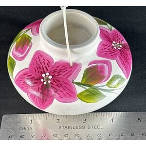 Vintage hand-painted ceramic hanging bird feeder featuring bright pink floral motifs with integrated feeding holes at the center of each flower. Designed to hang outdoors and attract birds with both color and function.