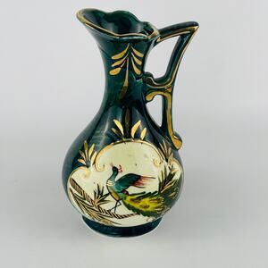 Hand Painted Ceramic Peacock Pitcher Gold Trim 7 1/8”