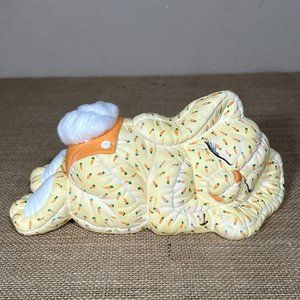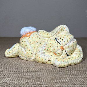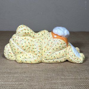 This sweet sleeping bunny has a cotton ball tail and carrots painted all over. The hole in the bottom appears to be for a coin bank but there's no slot for coins. He is signed by the artist and dated 1986 on the underside.