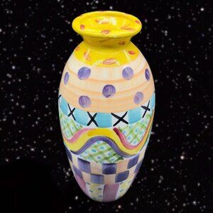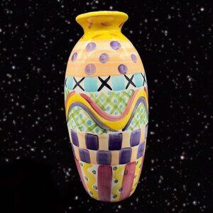 Hand Painted Ceramic Tall Vase Abstract Signed By Artist 1996 Pottery 11.5”T 3”W.