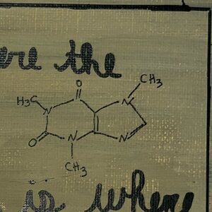 Hand painted sign that says “ home is where the heart is. The heart is where the coffee is.” with the atomic structure for caffeine on it.