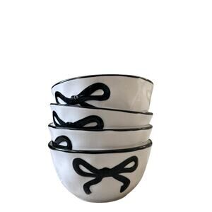 Hand Painted Coquette Black Bow Salad Bowls 6.25in White Ceramic Set of 4 NEW