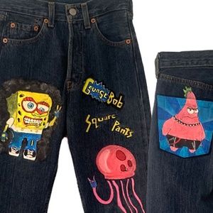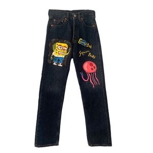 Levi's custom made Spongebob Square Pants denim jeans intruducing **GRUNGEBOB!** Straight leg dark wash. Two pockets front and back. Your classic levi's style. Measurements: Waist: 25" Length 30" Perfect condition