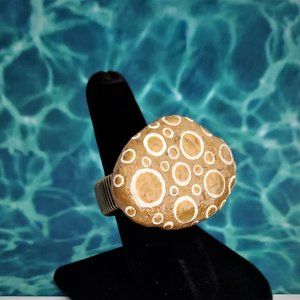 Hand Painted Dot Art Gold and Parchment Statement Ring. The Ring is a hand painted river stone in gold and parchment with a glossy finish. It’s on an adjustable ring base that fits size 8 to 10.