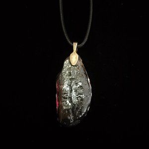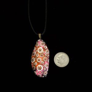 Hand Painted Dot Art Pendant. The Pendant is a river stone with Copper and White spheres on a multicolored abstract flowing background and a glossy finish. It’s on a waxed cotton cord that measures 20” in length. It also comes with an extra 2” chain extender for length adjustment