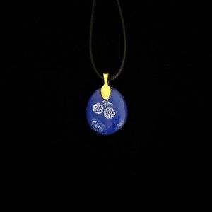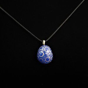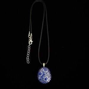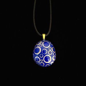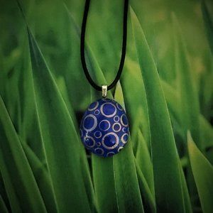 Hand Painted Dot Art Pendant. The Pendant is a river stone in Cobalt Blue with Gold spheres and a glossy finish. It’s on a waxed cotton cord that measures 20” in length. It also comes with an extra 2” chain extender for length adjustment