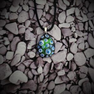 Hand Painted Dot Art Pendant. The Pendant is a hand painted river stone with Blue Sapphire and White spheres on a multicolored abstract flowing background and a glossy finish. It’s on a waxed cotton cord that measures 20” in length. It also comes with an extra 2” chain extender for length adjustment