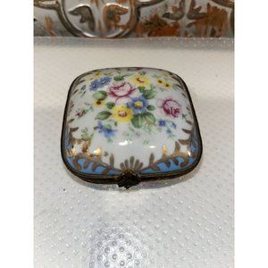 Hand Painted Floral Trinket Box Vintage Hinged Porcelain. This is a beautiful little trinket box. Floral with gold accents on the top and all the way around the sides. Inside there are 2 additional little flowers. There are no marking on the bottom. Measures approx. 2.5" on all sides.