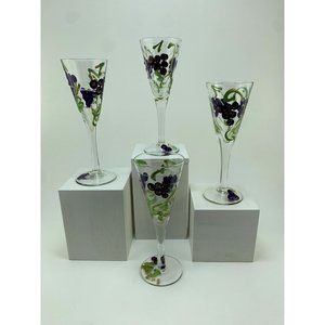 Set of four. For that special collector of hand painted glass. Very delicate. Beatifully done grapes/leaf art work. Stunning art glass design. Art glass style. For that special occasion. Stands 6". In perfect condition. Great gift idea. Cheers. Thanks for looking.