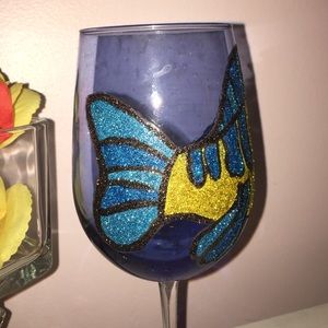 This is a beautiful Wine Glass I made with family when I wanted to make a character themed room in my home! I never got the chance but the glasses are just gorgeous! I am currently in the process of painting more! The glitter is sealed so it will not just wipe away when washing. Hand wash only! Original price includes all materials bought to make them!