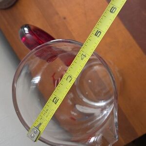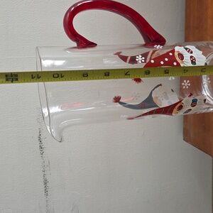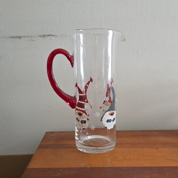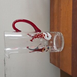 Clear glass pitcher featuring a festive Gnome Design with a red handle.