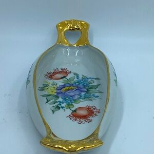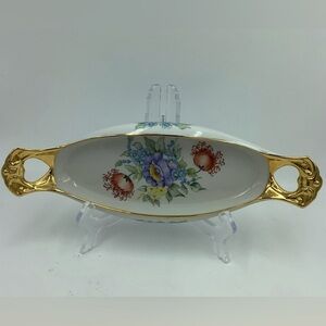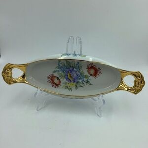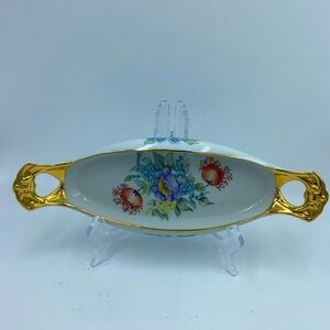Beautiful hand painted, gold handled boat- shaped dish/bowl featuring flowers on inside and outside. Unusual shape. Pre-owned, good condition.