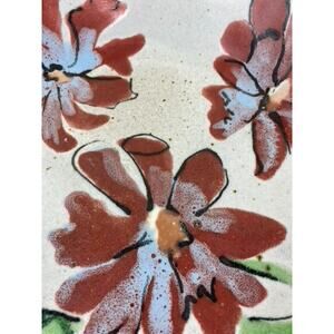 Lovely turned bowl with a wonderful pebble glaze on the outside and painted flowers on the inside. Measures 10" wide, stamped by maker.