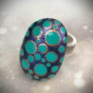 Hand Painted Iridescent Blue Statement Ring. The Ring is a hand painted river stone in iridescent blue with rose gold and turquoise spheres and a glossy finish. It’s on an adjustable ring base that fits sizes 8 to 10.
