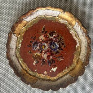 Hand Painted Italian Decorative Wooden Plate Florentine Floral Gold Accents Tray 1960s