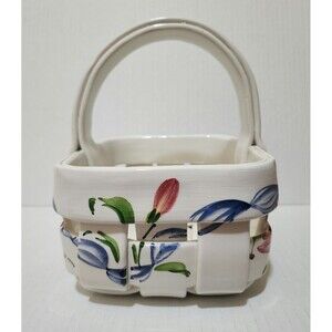 Hand Painted Italian Pottery Ceramic Woven Basket with Handle Floral Design