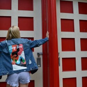 Super comfy, hand-painted denim jacket. It was painted with acrylic paint and heat pressed with an iron. Safe to hand wash but paint might fade over time. Size large, but oversized denim is all the rage. Models in image normally wear small but easily fitted them. So cute and trendy!! Stand out with a new fall piece.