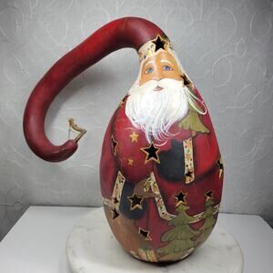 This incredible hand-painted Santa gourd is a true statement piece for the holidays! Featuring a whimsical curled stem and detailed folk art painting with star-shaped cutouts for light to shine through, this piece glows beautifully when illuminated. Perfect as a centerpiece, mantle decor, or unique rustic accent for your Christmas collection.