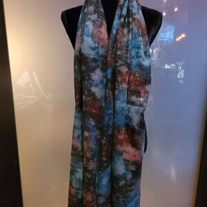 This scarf is brand new, has never been worn, and is in excellent condition. It is 85% Merino wool and 15% silk; however, it is extremely lightweight. It is multi-colored with dark neutral hues of rust, blues, and turquoise. It is an abstract design. The first photo shows one way to wear the scarf. The second photo shows the entire scarf. The scarf is approximately 77" long x 27" wide. It has deliberately frayed edges on the long ends. And because it is so large, you can even wear it as a sarong over a bathing suit or pants.
