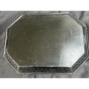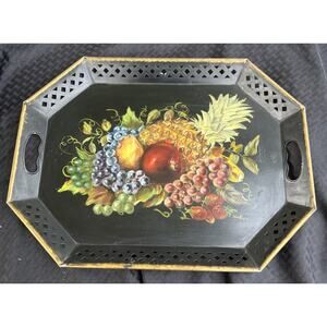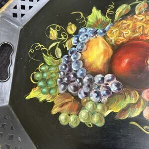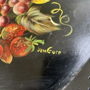 Hand Painted Metal Serving Tray Barware Black Gold Fruit Decorative Signed VTG