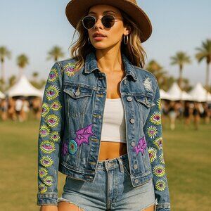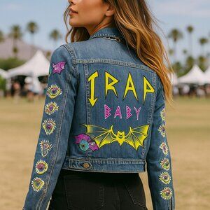Stand out from the crowd with this one-of-a-kind hand-painted denim jacket, made for bold personalities and unforgettable nights. Covered in psychedelic eyeballs, neon bat wings, and vivid graffiti-style graphics, this jacket screams festival season energy — perfect for rolling deep at Coachella, Trap karaoke, or underground warehouse parties. Distressed and cropped to perfection, it pairs flawlessly with cargo pants, mini skirts, or platform boots. There’s only one like it — once it’s gone, it’s gone.