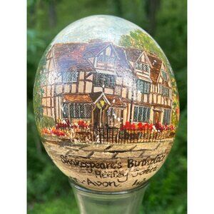 This hand painted ostrich egg depicts Stratford Upon Avon... Shakespeare's home. The detailed painting shows William Shakespeares birthplace as. well as Anne Hathaway's cottage and other areas of interest in that town. The large, multicolor egg features an all-over hand crafted design and is adorned with a glossy finish. A beautiful piece of art, this ornament captures the essence of British heritage and historical figures, making it a unique and romantic collectible for adult theatre and art enthusiasts. With intricate details and a touch of celebrity intrigue, this decorative piece is a perfect addition to any collection of period-style decor.