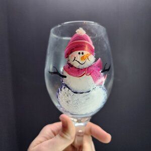 Hand Painted Pink Snowman Stemmed Wine Glass Winter Christmas 9'' Tall