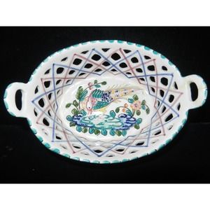 This hand painted Porcelain Basket was made and painted in Portugal. This beautiful basket measures: 6" in length and is 4 " wide. Is in very good condition. NOTE: Re. to paint colors on the webbing, What appears to be Pink is really like tan and what appears to be Blue is really Green , Sorry. #8414