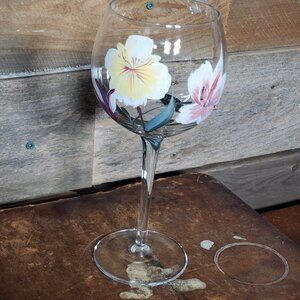 Hand Painted Red Wine Glass - Pink & White Lilies. Measures 8 1/2". Stem is 4 1/2".