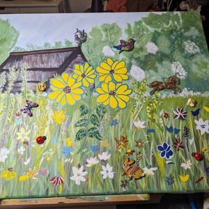 Brighten your space with this charming one of a kind hand painted art scene. The scene of a country barn in a meadow with beautiful flowers, acrylic ladybug, bird. Handmade horse, bird and don't forget the rooster sitting a top of the rustic barn...I put many little items into this work of art, it also adds dimension. Featuring vivid yellow flowers and lush green foliage, it adds a touch of nature to any room.