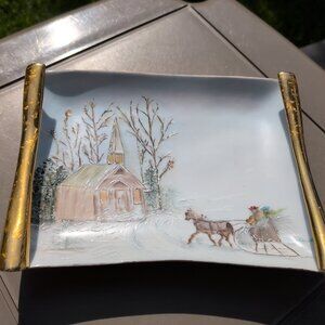 Hand Painted Trinket Tray Winter Church Scene With Sleigh