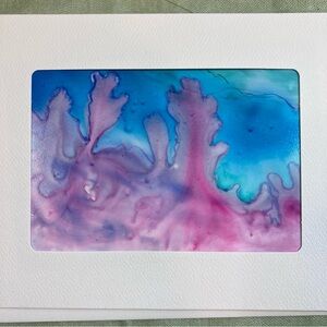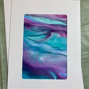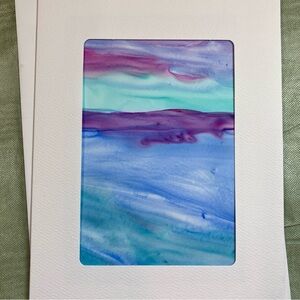 -Materials: Yupo paper, artists quality paints. Sealed with a spray varnish or fixative. Card stock: Strathmore brand photo frame cards - white with die cut window.