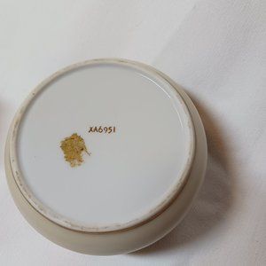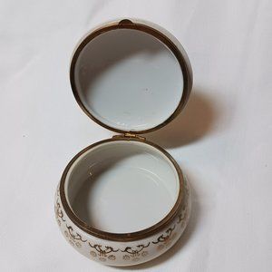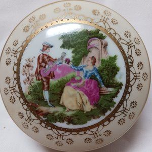 Stunning hand painted vintage porcelain metal hinged trinket box. It is cream color with gold accents. The center portrays a lady with being played music to. Colors are lovely, For its age the condition is fine. The bottom has a number but that is all. Measurements are 3 7/8"across and 2 1/2" in height. There are no breaks, chips or cracks. It has been well cared for.