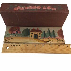 Hand Painted Wood Slide Top Box Cottage Farm Scene Teacher Gift Vintage Decor 8"