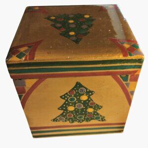 Festive hand-painted wooden box with charming Christmas tree design, suitable for small items or seasonal decor. C