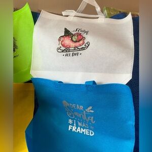 Hot off the Press! Great lot of very unique Holiday Gift bags, fiber bags, reusable, with a heat pressed transfer on each bag! 4 bags, each 12” by 14”, all with a fold out bottom. Very unique, one of a kind!!