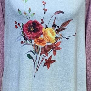 This upcycled long sleeve sweater is a ladies large, 76% rayon, 20% polyester, 4% spandex and in excellent condition. This floral bouquet includes a peony, berries and leaves. chest: 20" across, length: 27" So pretty!