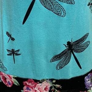 Hand Printed Upcycled Womens Small Dragonfly Floral Rayon Blend Blouse Tee