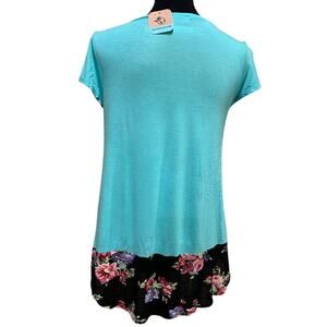 This upcycled short sleeve with floral print accent tee is 95% rayon and 5% spandex, It is a womens size small and in excellent condition. chest is 16" across, length is 24", so pretty!