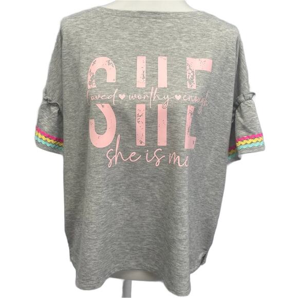 Hand Printed Upcycled Womens XL She Is Me Loved Worthy Enough Bell Sleeve Top