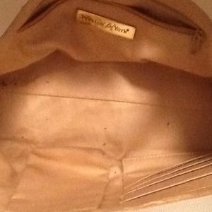 Preston & York Purse in good condition.Off white fabric with white handles.This purse was given to me so I don't know anything about it.There are some stains in bottom of purse on inside that may come out with washing.There are also a few minor stains on front.Cleaning will probably get those out.