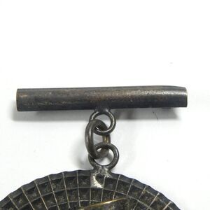 Fairly large pin; the circle is about 2 inches in diameter, and the total length is approximately 3 inches. Unsigned, and not marked with a metal content. It shows overall wear to the metal finish, as seen in photos.